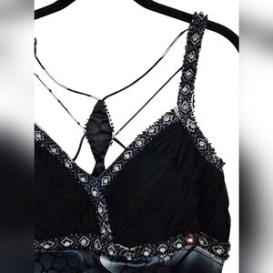 Black ruched bodice with sequin beading along the sleeves and bodice and beautiful back detailing