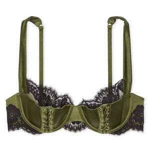 ATELIER x Victoria's Secret Satin Lace Trim Lightly Lined Balconette Bra in the color Woodland Green and the size 34D. Brand new, authentic, with tags. Discontinued and very rare. One available for purchase.