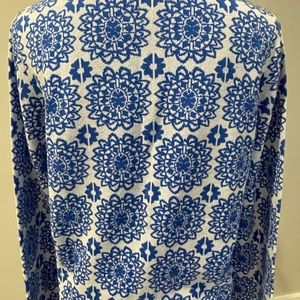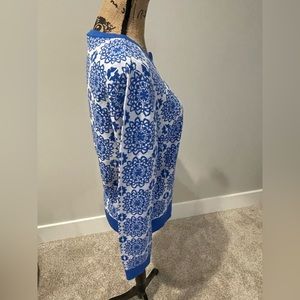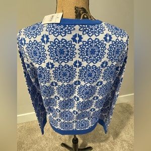 Beautiful Ann Taylor Factory Cardigan with front buttons in a nice blue color… with solid blue band around the neck, waist and wrist for a more elevated look!