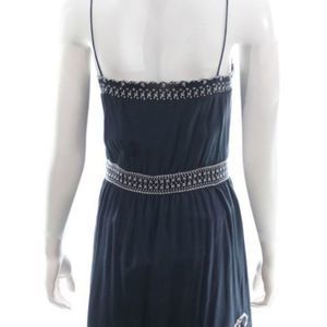 Athé Vanessa Bruno Navy Blue Silk Spaghetti Strap Dress With Ivory Embroidered Detailing, Embroidered Bust, Waistline & Bottom, Elastic Waistband, Paisley Pattern Embroidery Along Bottom, Side Zip Close With Hook & Clasp Close, All Items Are Guaranteed Authentic.