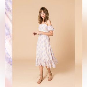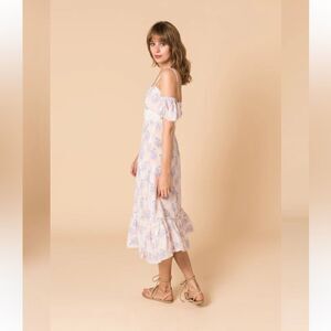 A beautiful flowy dress, with off-shoulder sleeves, with a delicate lace trim, featuring a beautiful light pink and purple flowery print.