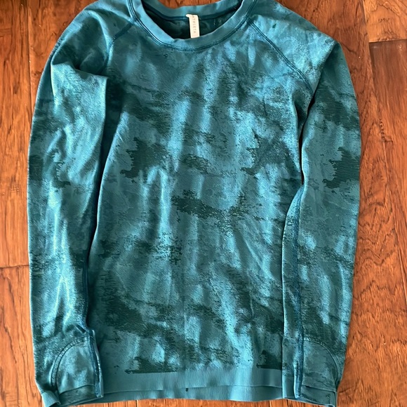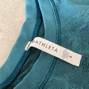ATHLETA ATHLETIC TOP. SIZE S. LONG SLEEVE. BLUE multi shade design. Care and Composition shown together. Excellent condition. No rips or tears. Smoke free home. $25.