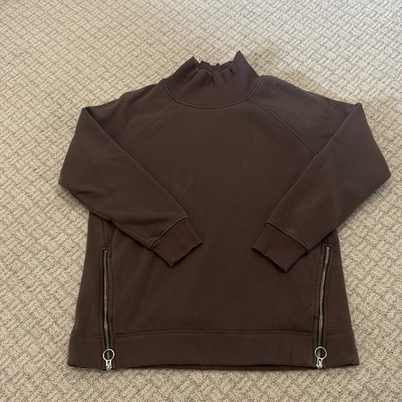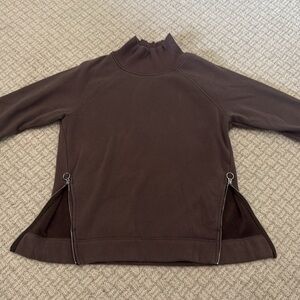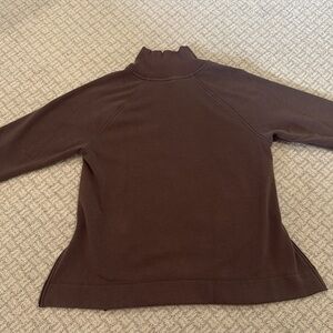 This mock neck sweater/sweatshirt is so cozy and perfect for cooler weather with its thick soft material on the inside. It’s a beautiful brown/clay color. Still in very good condition.