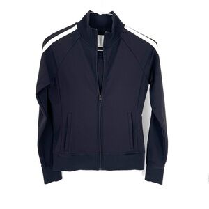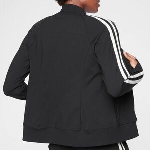 iconic track stripe detailing along arms/sleeves -relaxed fit w/crop length that hits at hip -lightweight fabric soft to the touch -wicking -breathable -UPF -style & function -ribbed detail at hem,sleeve hem & neckline -standup collar -front zip closure w/chunky zipper pull w/ATHLETA embossed -thumbholes to keep hands warm -inside pockets on both sides -front side pockets w/hidden zip closures,ATHLETA embossed on zipper pulls