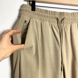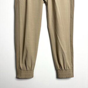 - Keywords: high rise, elastic waist, drawstring, windowpane print, taupe/beige color, joggers, pockets, zippered pocket, athleisure, casual, ribbed side panel, travel