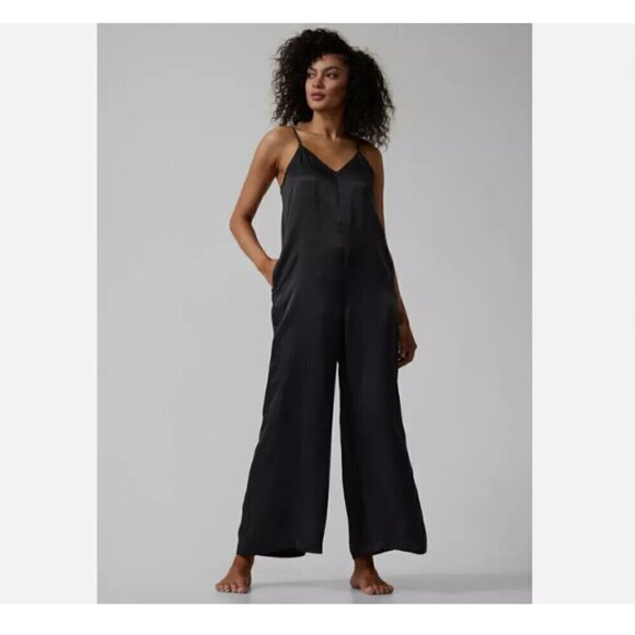 ATHLETA Calm Cool Versatile Sleep Or Dressy Romper Wide Leg Black Pocket RT$119
