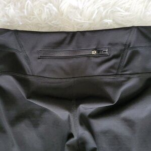 Beyond sleek supportive fabric offers compression. Wicking pulls sweat away. Breathable. Cropped, capri length. Back zipper pocket on waist.