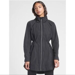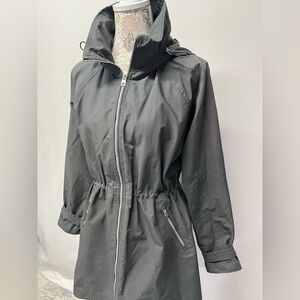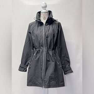 Women’s Gray hooded full zip trench jacket from ATHLETA, size S. Jacket has 2 side zip pockets and 2 cinch toggles on the inside.