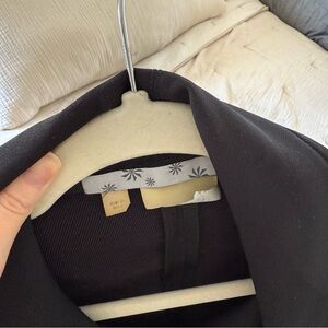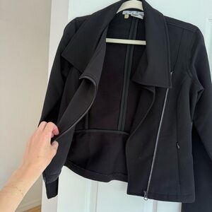 Stylish and versatile black jacket perfect for any occasion. Features a sleek design with a comfortable fit. Sporty material (94% polyester, 4% spandex). Super comfy and stretchy. Very flattering style! In excellent condition with no flaws. Tag is falling apart but not noticeable when worn.