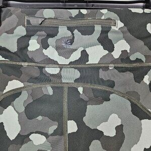 ATHLETA Lightning Camo 7/8 Tight Legging in Mountain Olive (Multi Green), size L. Style# 487500-02. Pull on, outer thigh pockets, back waistband zipper pocket, hidden waistband key pocket. Minor piling/wash wear in spot on left pocket as shown in last photo, otherwise great pre-owned condition.