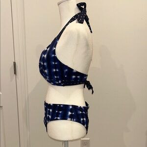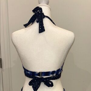 Dive into style with this Athleta bikini top, featuring a striking blue tie-dye pattern. The halter design with adjustable neck ties offers a comfortable fit, while the classic triangle cut adds a timeless touch. Perfect for beach outings, this top combines a casual aesthetic with a unique shibori-like effect.