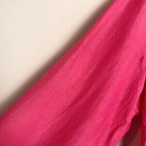 Athleta swim coverup dress in a pink to red ombré. Super soft silk and cotton blend. Drawstring waist for flattering fit. Long sleeves with v neck.