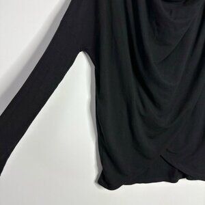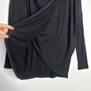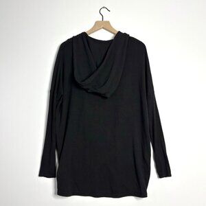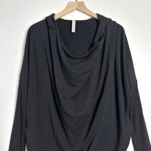 - Keywords: ribbed long sleeves, thumbholes, pullover, wrap front, drapey, relaxed fit, hooded, hoodie, lounge, yoga, athleisure, travel, soft, cozy, solid black