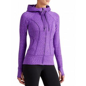 This is a gently used Athleta Space Dye Strength hoodie in a vibrant purple color.