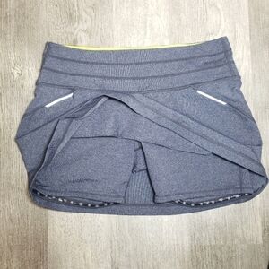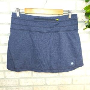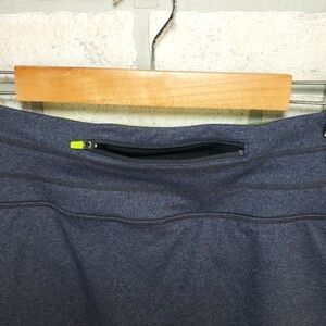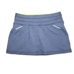 The skort has an thick elastic waistband with a back zipper pocket and sports grip on the inside of shorts bottom hem and 2 front reflectors, lots of stretch. Excellent condition.