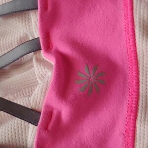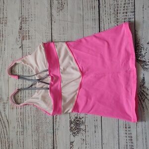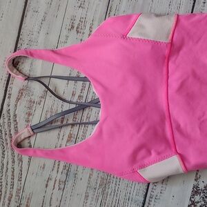 Fun bright tank in the Start Up style. Crisscross straps in back. Removable padding in the built-in bra. Good used condition with a bit of minor fading from light wear. (P)