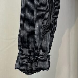 Drawstring waist, hand pockets, tapered leg, ankle length, cuffed. 100% linen in navy blue stripe.