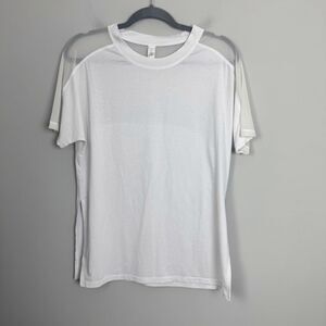 Experience the ultimate in comfort and style with the Athleta White oversized Short Sleeve T-Shirt. This relaxed-fit tee features a minimalist design, perfect for effortless everyday wear or workout attire. Crafted from soft, lightweight fabric, it offers a smooth, clean finish that complements any casual ensemble. Mesh detail across the shoulder. Side slits. Tiniest pull as shown. Otherwise great condition. Women’s size small.