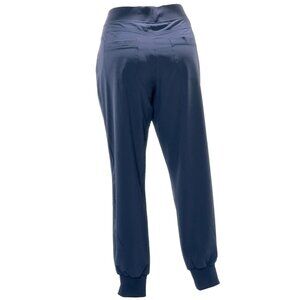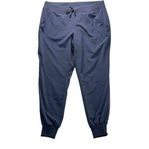 Stylish and comfortable Athleta blue joggers for women, made from stretch polyester ensuring a snug fit. These pants feature a full elastic waist with drawstring and front and back pockets for added convenience.