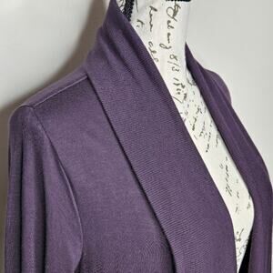 Stay cozy and stylish with this elegant purple open front cardigan. Perfect for layering, this butter soft sweater has a lot of stretch and thumb holes at the cuffs for extra comfort in everyday wear. Labeled an XS, it will definitely fit Small and Medium figures.
