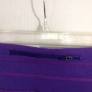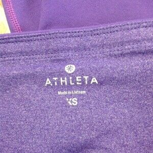 Size x-small purple Athleta Relay capri leggings. **Stock photo is more of a blue than purple. Leggings are purple with pink/purple stitching. All photos except the first one are of actual leggings you will receive. Drawstring loop at waist for adjustable fit. Back zipper closure pocket. Mesh panel with ruching at back of calf. Reflective details throughout.
