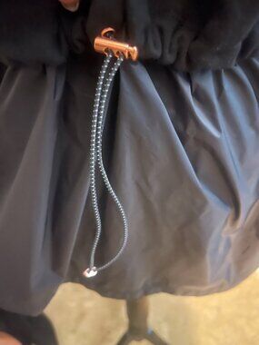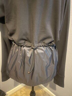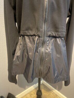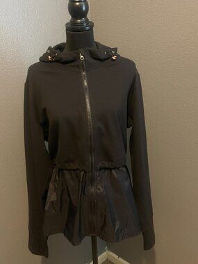 Stay active and comfortable with this Athletic windbreaker/fleece long sleeve, full zip closure for easy wear. Rose gold accent Upper hoodie Sweatshirt material on top & weather repellent material at waist and down Thumb holes Gathered at waist- can be adjusted gathers at hood - can be adjusted.