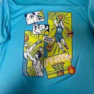 Vibrant blue long sleeve shirt with a colorful graphic design on the front. Graphic designs are basketball themed.