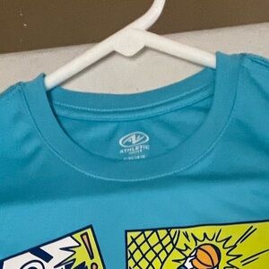 ATHLETIC WORKS BOYS BLUE LONG SLEEVE GRAPHIC SHIRT SIZE XL (14-16). Polyester