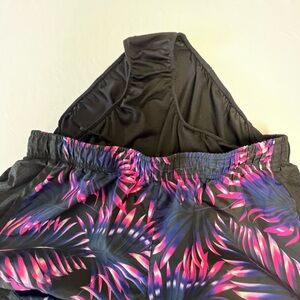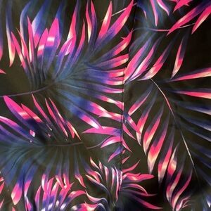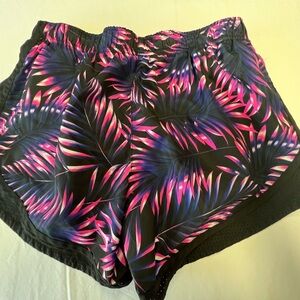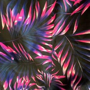 Vibrant shorts with a tropical leaf design. Features pink and purple hues on a black background. Like new