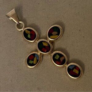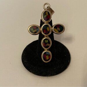 ATI STERLING SILVER 925 PENDANT CROSS MULTI COLOR OVAL LINK INLAY BLACK RED YELLOW BLUE PINK GREEN PURPLE MEXICO
