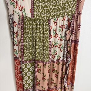 Style: Gypsiana boho maxi dress with a mixed patchwork floral print in pink, green, rust, and cream tones.