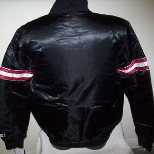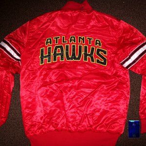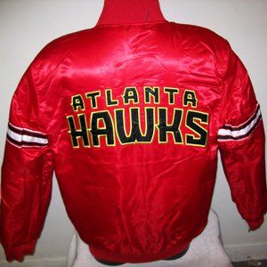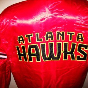 ATLANTA HAWKS Snap Down STARTER JACKET. Size: S, M, L, XL. High quality Polyester Satin Jacket with a snap up front and ribbed knitted cuffs, collar and waist band. The jacket has a nylon outer shell and the inside lining is soft diamond stitched polyester. The "HAWKS" Lettering & Logo meticulously sewn on. Color: RED with YELLOW & WHITE Trim. Shipped out of NY/NJ zone. Measurements: S: 23, M: 24, L: 25", XL: 26" " across chest..arm pit to arm pit. Top of Collar to waist: 32" VERY NICE DESIGN.