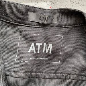 ATM ANTHONY THOMAS MELILLO SLEEVELESS TUXEDO DRESS IN BLACK. Tuxedo-inspired pleated bib fronts hi-lo dress, Mandarin collar, Sleeveless, Partial button front, Pleated bib, Notched hi-lo hem, Pullover style, Size Small.