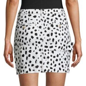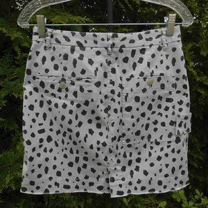 ATM Anthony Thomas Melillo animal-print stretch mini skirt in pale silver combo color with belt loops, zip-fly with button-closure, front curved pockets, one back welt pocket and one back patch pocket with button-closures, back shaping seams, utility loop, back vent and double raw hem