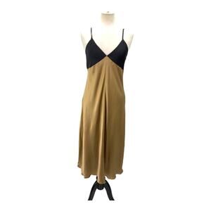 ATM Anthony Thomas Melillo Contrast Detail Silk Satin Slipdress Size Medium; black and tan; From Nordstrom Color-blocked triangular cups and a front seam update this bias-cut satin slipdress that pours over your figure like liquid silk down to a rippling hem.