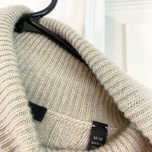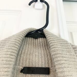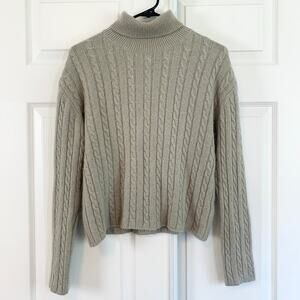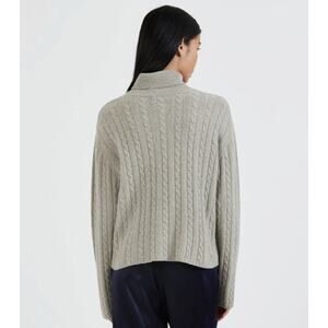 ATM Anthony Thomas Melillo Luxe Wool Cashmere CableKnit Turtleneck Sweater in Pumice Gray Biege. The classic cable-knit sweater, done in a soft wool cashmere blend, features intricate cable stitch details and a ribbed turtleneck. The drop shoulders and boxy fit meet a cropped silhouette that makes this piece exceptionally cozy. It is finished with zig-zag knit at the cuffs and hem. Great used condition.