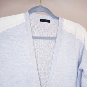 Rib-knit sleeve stripes add sporty contrast to an oversized merino wool cardigan lightened up with open thermal stitching in back.