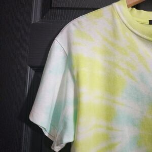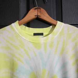 It combines the weight and shape of a men's piece with the fit of a women's tee. It features a slightly cropped, boxy shape with longer and wider cut sleeves. It is updated for summer in a unique tie dye.