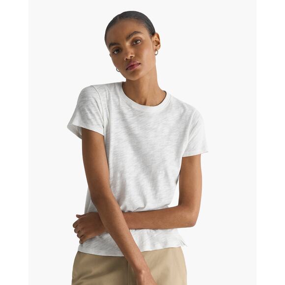 ATM Anthony Thomas Melillo signature Slub Jersey Schoolboy Crew Neck Tee in white with subtle silver threads that give a soft, glitter-like sheen. Lightweight, slightly sheer slub cotton with a shrunken straight fit and relaxed drape. A core Essentials Collection style known for its elevated basics and premium Peruvian cotton.
