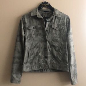 The iconic trucker jacket in stretch cotton camo print; fully lined; front pockets; button front and buttons cuffs. Adjustable buttons on the waist to custom fit.