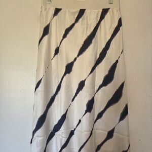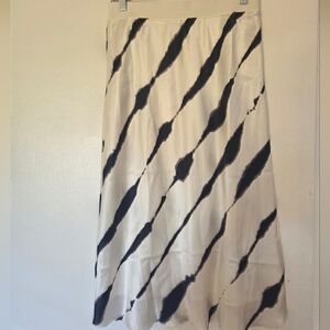 The Silk Charmeuse Tie Dye Stripe Pull-On Skirt is cut with a fluid drape that falls to a flattering curved hem just below the knee. It features a cotton elastic waistband that adds ease and comfort, and a fresh inky tie dye pattern for the new season.