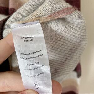 A warm stripe print adorns this wool blend sweater, perfect for the winter months.