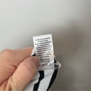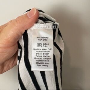 Stunning lightweight long sleeve tee with horizontal black and white stripes. 100% cotton. Size large. About 21.5 inches from pit to pit laying flat. About 20.75 inches long in front and 21.75 inches long in back. Excellent condition with no defects.