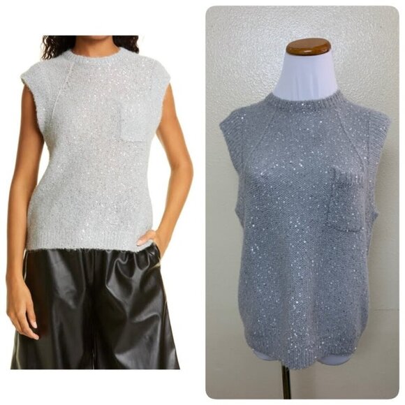 ATM Anthony Thomas Melilo Womens Sequin Crew Neck Knit Sweater Vest SMALL Gray Fog