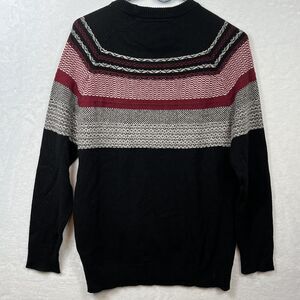 This is a beautiful soft black sweater in a gorgeous red and gray pattern. It comes from a smoke free home. Please let me know if you have any questions.