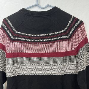 This is a beautiful soft black sweater in a gorgeous red and gray pattern. It comes from a smoke free home. Please let me know if you have any questions.