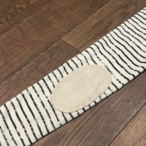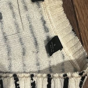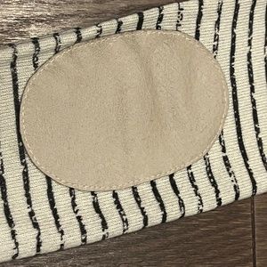 Awesome distressed style V-neck sweater. Cream and Black stripe. Cream suede patches on the elbows. Size Small. Cozy cozy sweater. Little worn spots on the stripes are original to the sweater and part of the design. Small spots are part of the charm.