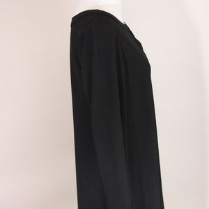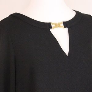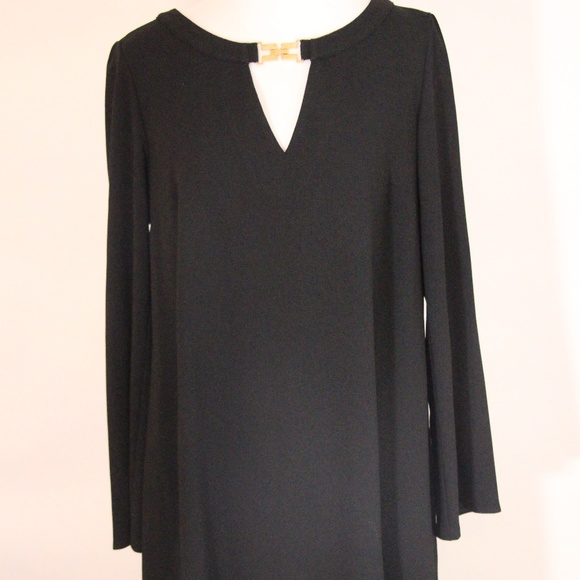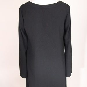 ATMOSPHERE Black Embellished Rounded Neck Long Sleeve Wide Cuff Women's A-Line Dress, Size 4. This stylish and sophisticated pullover dress has a beautiful black color hue, rounded neckline with a faux gold metallic closure, keyhole opening on the front neckline, long sleeves, wide cuffs and an A-line cut. The material is 97% Polyester and 3% Elastane. The approximate measurements are as follows: Length = 34", Bust = 36", Waist = 38", and Hips = 42.