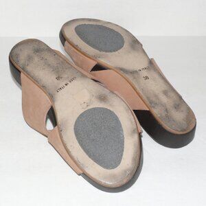 Vachetta leather upper, rubber soles with non-skid pads added. Slip-in design and elegantly crossed straps. Slight wedge as the front of the shoe is 1/2 inch and the heel of the shoe is 1 inch high.