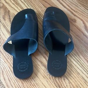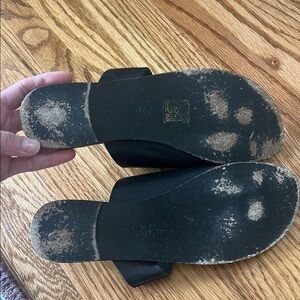 Stylish black leather slide sandals with a sleek design. Perfect for casual wear.